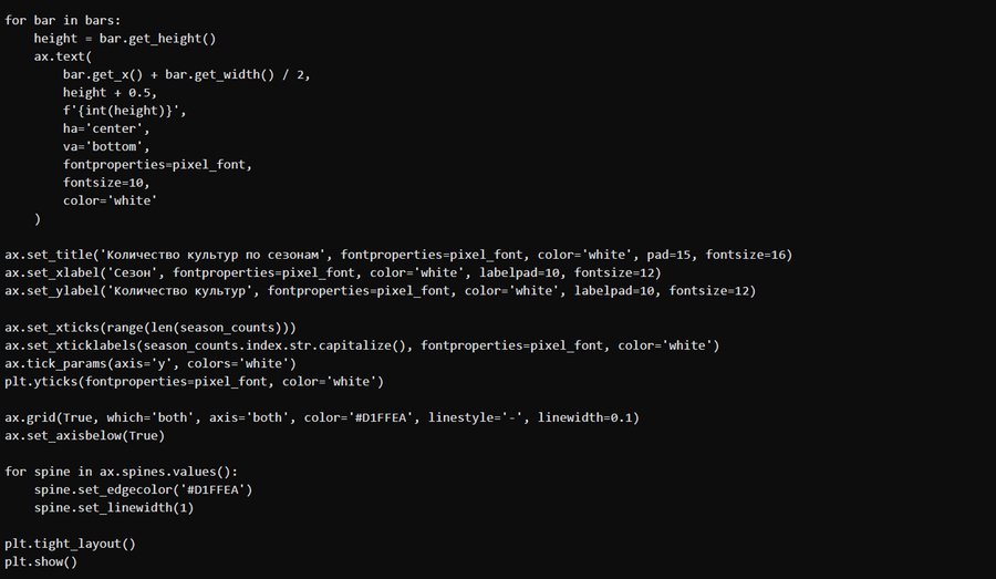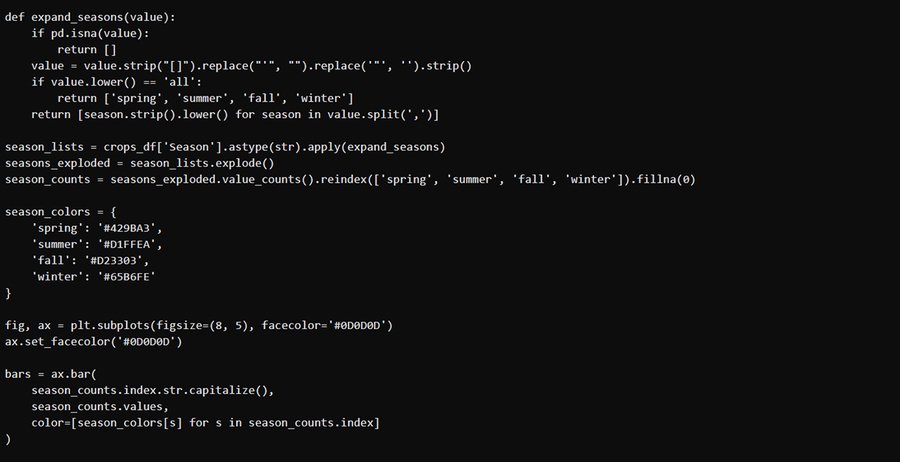Сначала я решила проанализировать, сколько культур растет в каждом сезоне. Для визуализации была выбрана столбчатая диаграмма. Так как времена года находятся в списках, пришлось преобразовать сложные записи в столбце — некоторые культуры растут в несколько сезонов, некоторые круглый год, что было учтено с помощью специальной функции.