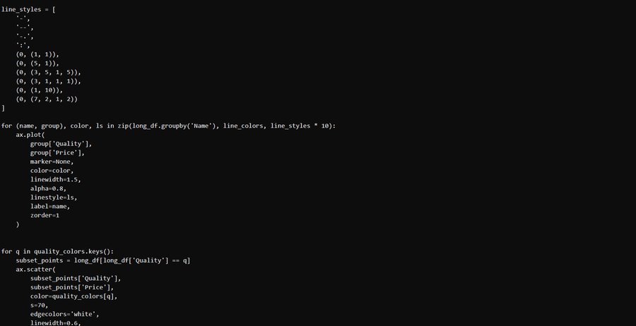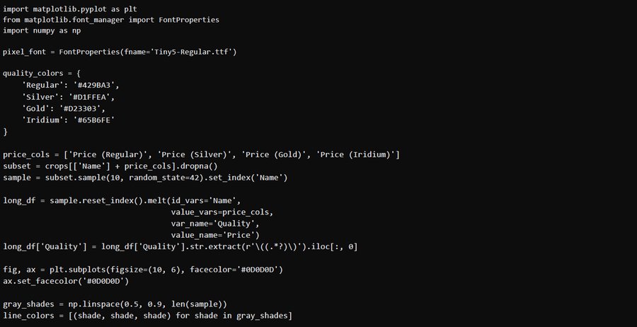 В игре цена культур зависит от их качества. Как сильно она растет? За какими культурами выгоднее тщательно ухаживать, а за какими не стоит? Для ответа на вопросы я сделала комбинированную визуализацию, сочетающую элементы линейного графика и точечной диаграммы.