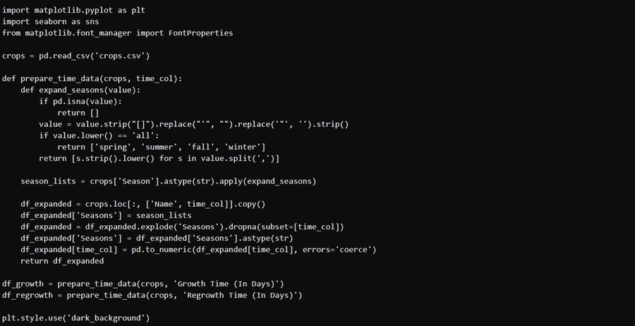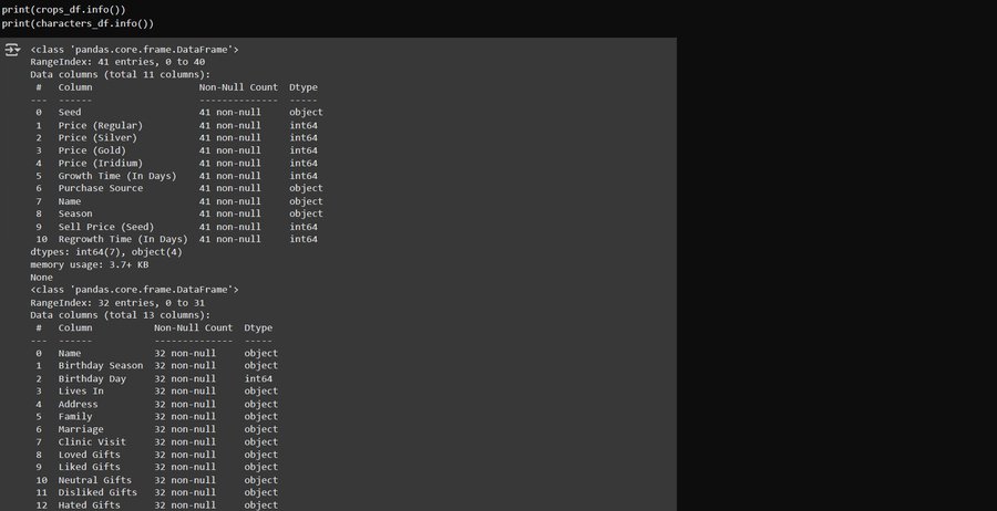 Я объединила данные о культурах и персонажах (два датасета на сайте kaggle.com), потому что в Stardew Valley все вращается вокруг смены сезонов, что влияет и на доступные растения, и на активность жителей, и на игровые события. Хочется рассмотреть, как разработчики создали гармоничный игровой мир, где сельское хозяйство и социальная жизнь переплетаются через сезонные циклы.