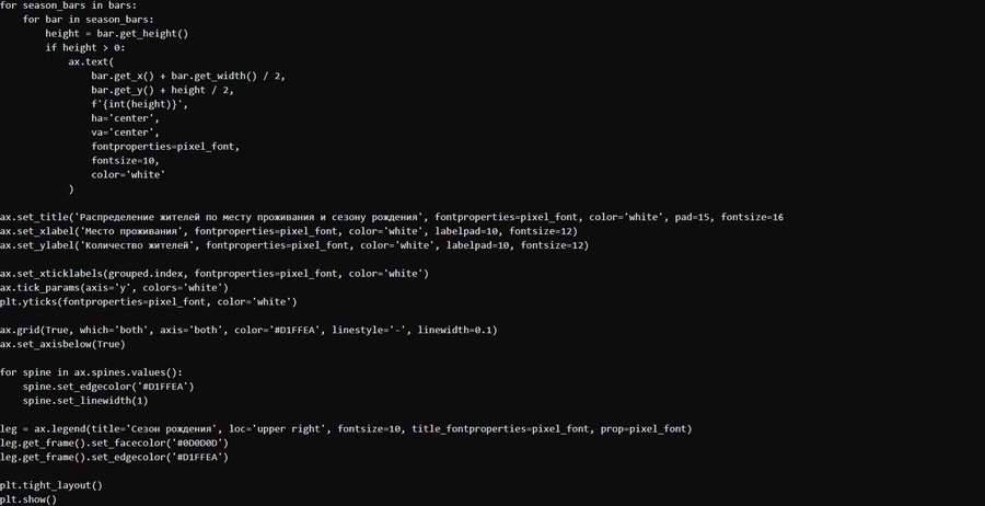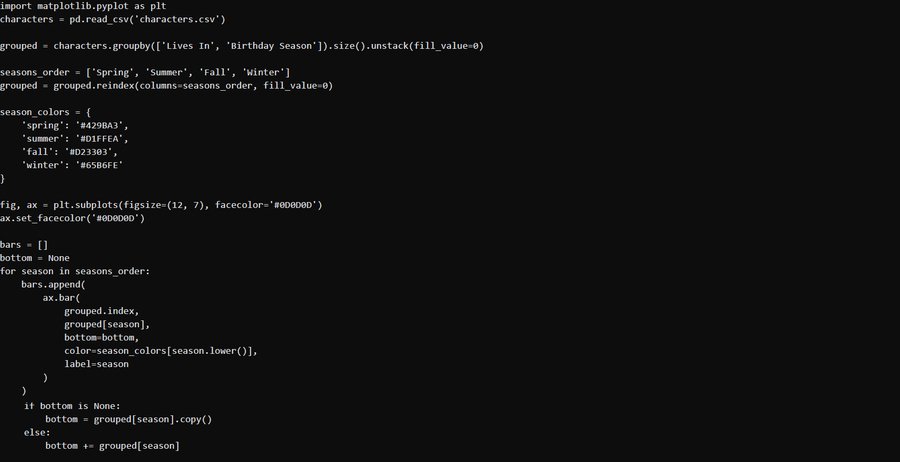 Такая визуализация помогает понять, как разработчики распределили персонажей по игровому миру, создавая баланс между разными локациями и сезонами. График также может быть полезен игрокам, которые хотят запомнить сезон рождения всех жителей, чтобы вовремя дарить им подарки.