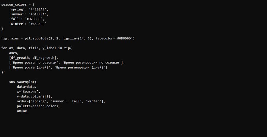Мне стало интересно, отличаются ли время роста и регенерация культур в разные сезоны. Для этого я взяла два swarmplot-графика.
