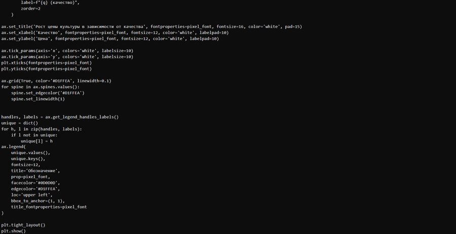 Самым неожиданным открытием для меня стал анализ цен на урожай. Повышение качества продукции дает нелинейный рост цены — переход на иридиевый уровень увеличивает стоимость в разы.