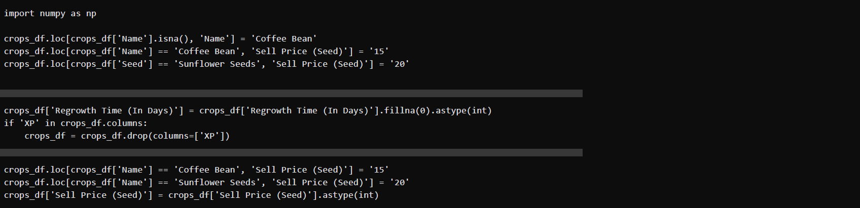 Я заполнила пропущенное название культуры 'Coffee Bean', исправила цены продажи семян кофе и подсолнухов, заменила пропуски в Regrowth Time (In Days) нулями и преобразовала в целые числа, а также удалила столбец XP.