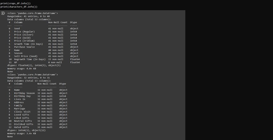 На этапе очистки данных я проверила структуру и качество данных в обоих датасетах. В датасете crops было 41 наблюдение с 12 столбцами, среди которых обнаружились пропуски в столбцах Name и Regrowth Time (In Days), а столбец XP оказался полностью пустым. В датасете characters все 32 наблюдения были полными, без пропущенных значений.