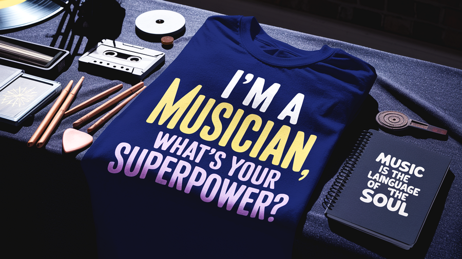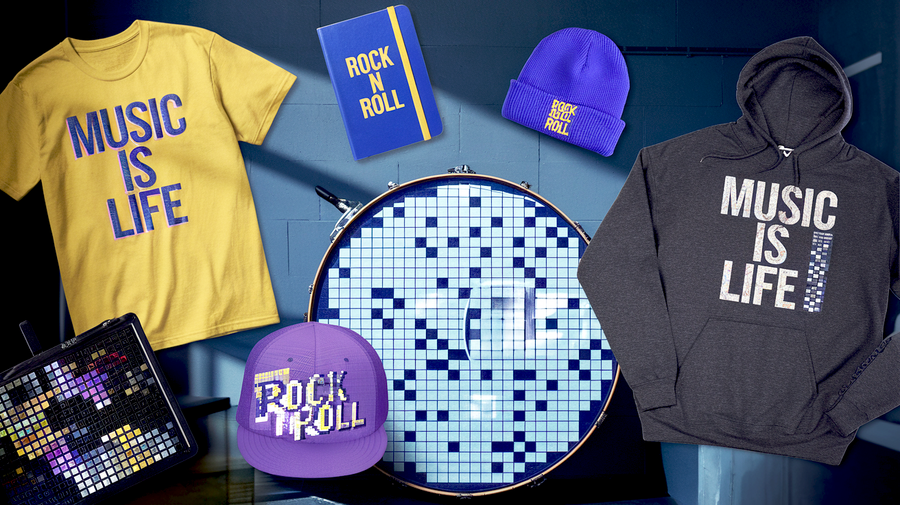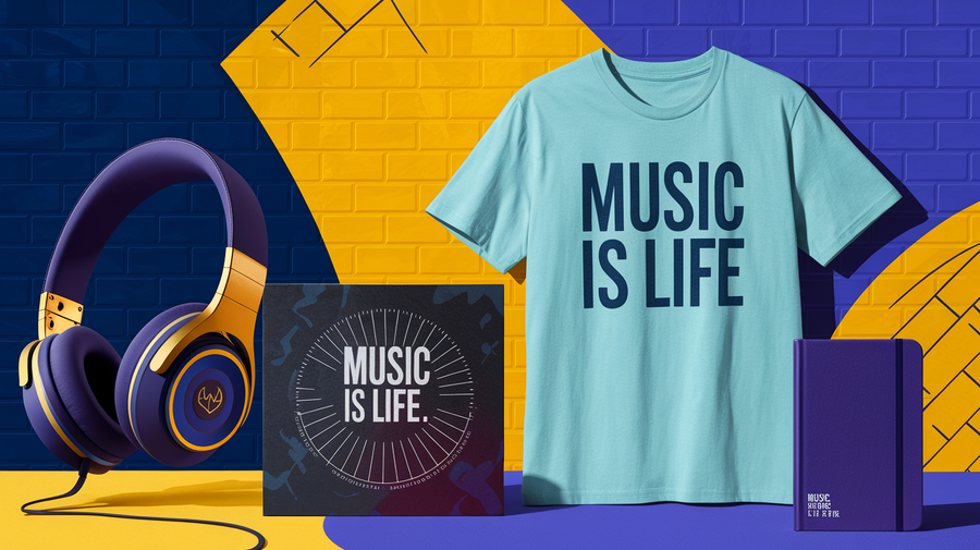 Промпт: 1. A soft-lit photo of modern street vibe merch in a music space. There’s a yellow t-shirt with the text «Music is Life». A blue notebook with the text «Rock 'n' Roll». A purple beanie with the text «Rock 'n' Roll». A dark grey hoodie with the text «Music is Life». There’s a music item with a mosaic of small pixels. The background is a dark grey wall. 2. A soft lighted photo of a modern, street vibe merch table. There is a t-shirt with the text «I’m a musician, what’s your superpower?» in yellow, blue, and purple. There is also a notebook with the text «Music is the language of the soul» in dark grey. There are music items such as a guitar pick and drumsticks. There are media items such as a vinyl record and a cassette tape. The table is covered with a dark grey cloth. The background is a brick wall. 3. A photo of a modern street merch setup with a yellow t-shirt that says «Music is Life». There’s a purple notebook with a dark grey cover. There’s a dark grey music item, likely a headphone, with a blue and yellow design. There’s a media item, likely a CD or vinyl record, with a dark grey background and white text that says «Music is Life». The background is a brick wall.