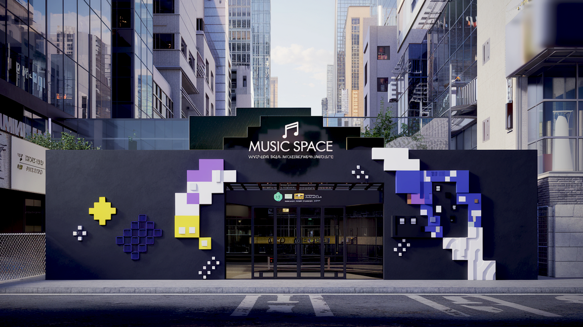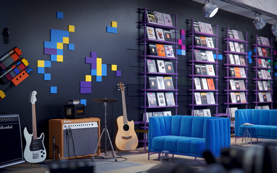 1. A 3D render of a modern, eclectic street vibe music big space photo. There are many music instruments. The matte dark grey wall has blue, purple, and yellow pixelated decorations. There are purple tall shelves filled with albums, and blue small sofas. The lighting is soft. 2. A 3D render of an exterior view of a music space in the center of a city. The building has a pixel-shaped dark grey facade with yellow, purple, blue, and white abstract mosaics. There are pixel decorations on the matte wall. The building has a modern architecture style. The background reveals a bustling city with tall buildings.