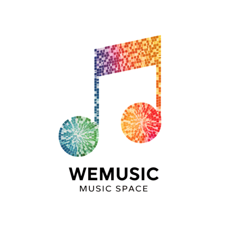 A minimal, 2D, abstract mosaic logo for WEMUSIC music space. The logo is made up of pixels and resembles fragments of a music sheet. The logo is in the colors blue, purple, and yellow with bright hues on a dark grey matte background. The emphasis is on clean and saturated tones.