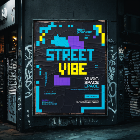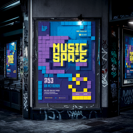 A 2d, modern, street vibe promotion poster for a music space event. The poster is blue, purple, and yellow pixels. The poster is hanging on a dark grey wall in a city street. The wall has graffiti. The overall image has a textured paper background. The scene takes place during a dark evening, and there are lights on the posters.