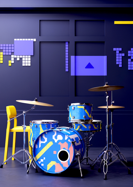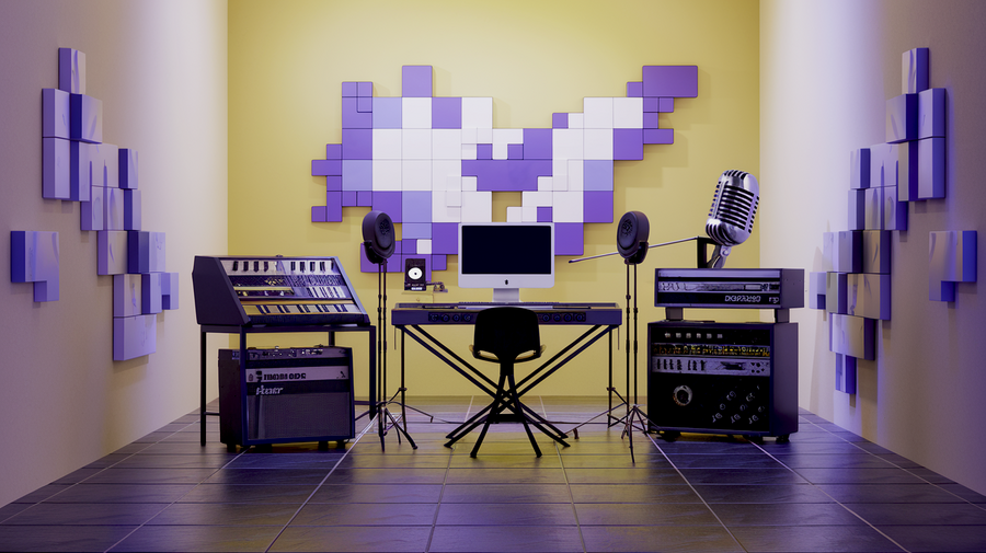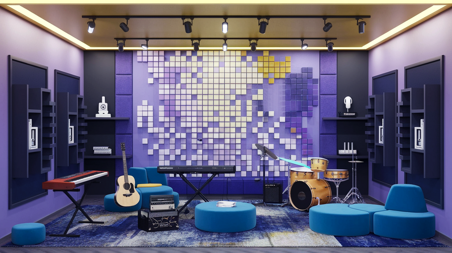 1. A 3d render of a modern eclectic music room. The room has a large abstract mosaic wall decoration with pixels. There are music instruments, including a guitar, a keyboard, and a drum set. There are also music recording items, such as a microphone and headphones. The room has a yellow ceiling, purple walls, blue furniture, and white accents. There are dark grey shelves and a rug. There is soft lighting in the room. 2. A modern eclectic 3D render of a music room with a yellow wall decorated with abstract mosaics of purple, blue, and white pixels. The room contains a white computer, a dark grey microphone, and various music recording items. The floor is made of dark grey tiles. The room has soft lighting.