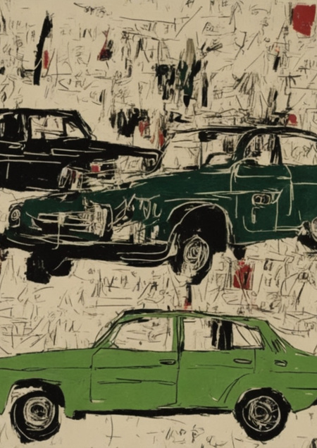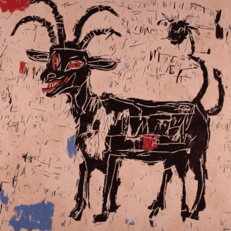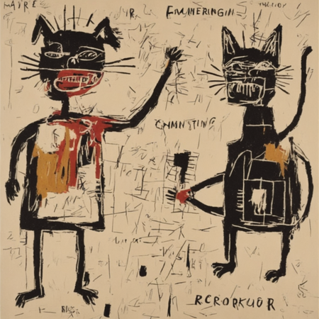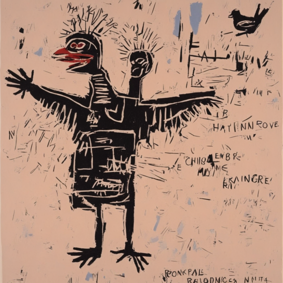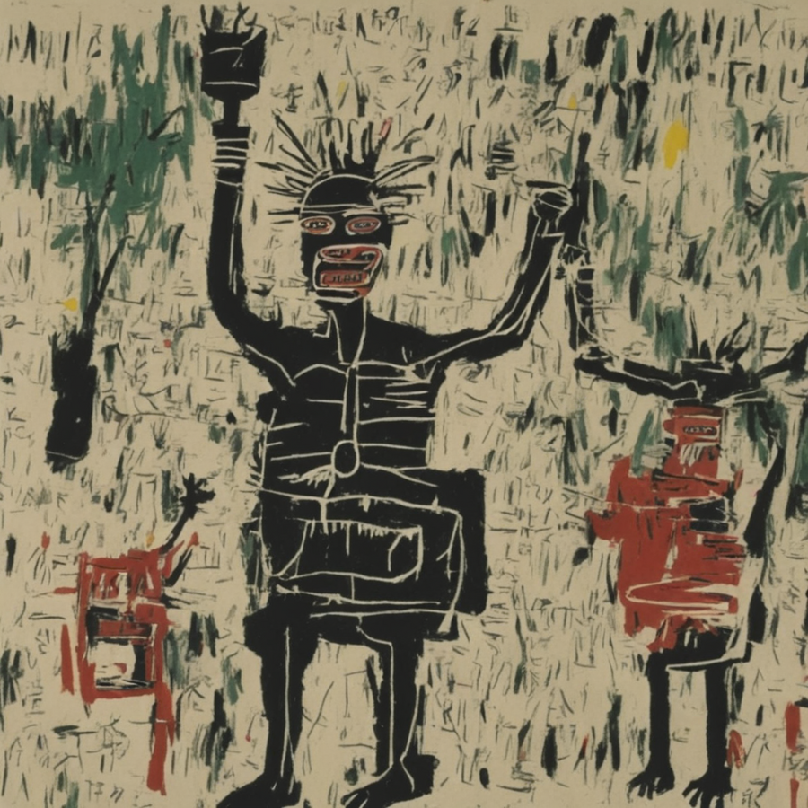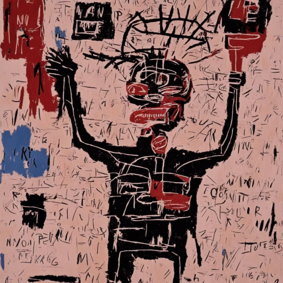 Для дообучения генеративной нейросети я использовала работы Жана-Мишеля Баския. Моей целью было научить модель воспроизводить его уникальную художественную манеру, сочетающую грубую самобытную экспрессию, символизм и элементы уличной культуры.