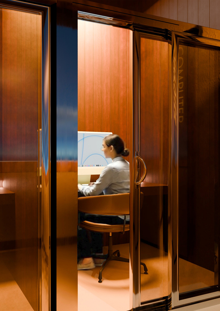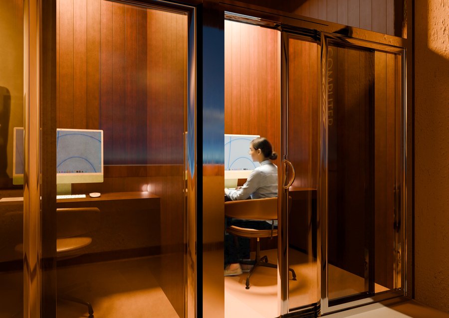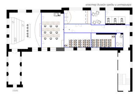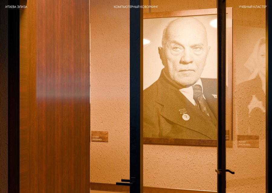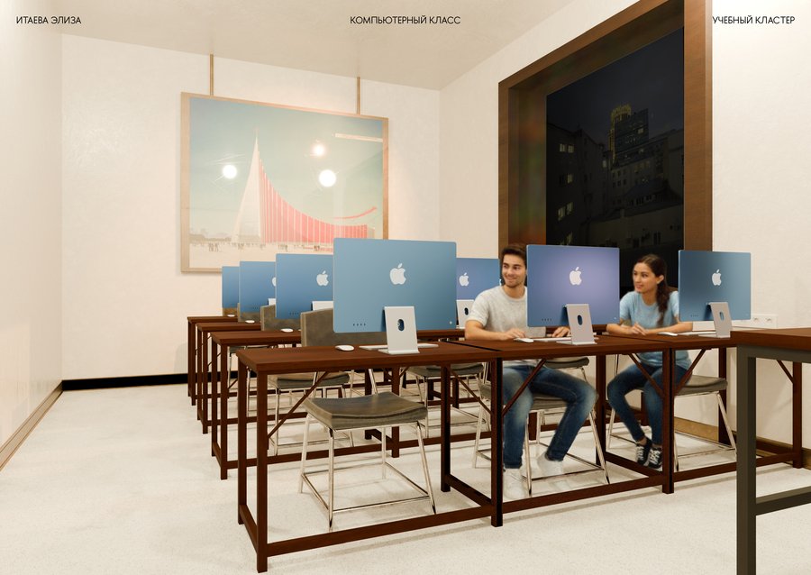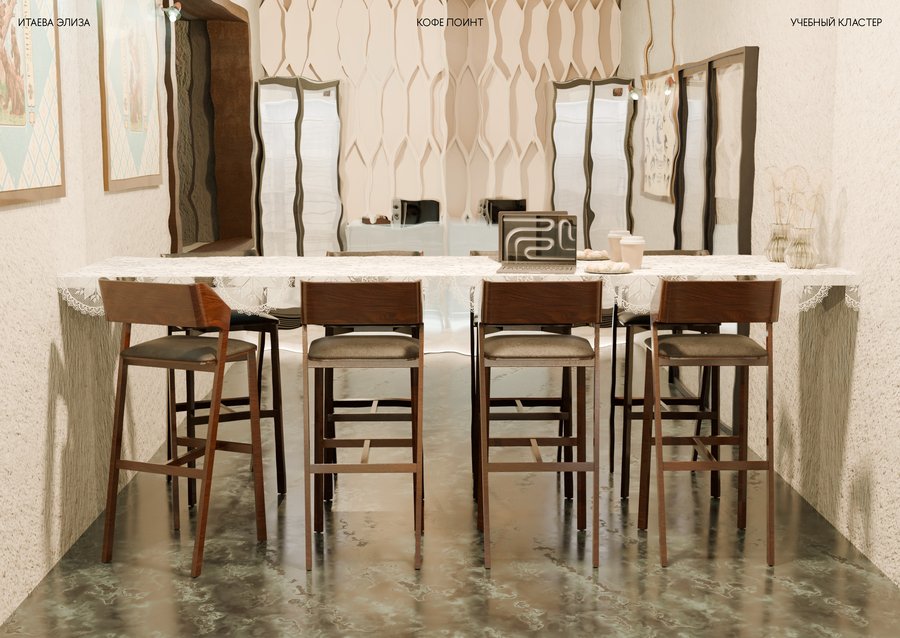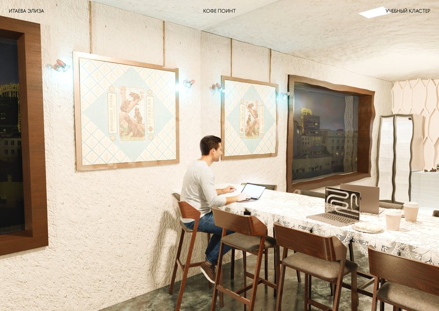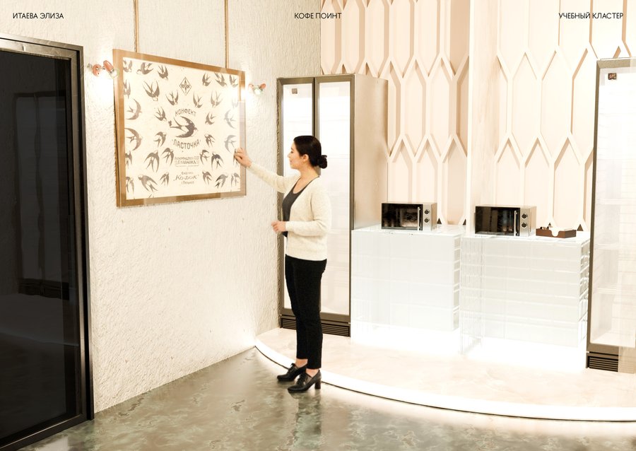Дизайн учебного кластера перекликается с прошлым здания Школы Дизайна и культурным кодом советской эстетики, близкой к сердцу любого россиянина. В этом интерьере встречаются различные материалы и детали, напоминающие советскую эпоху и отечественный культурный код — от кружева на столе, до стеклянных блоков на кухне кофе поинта.