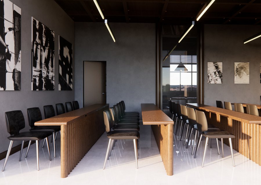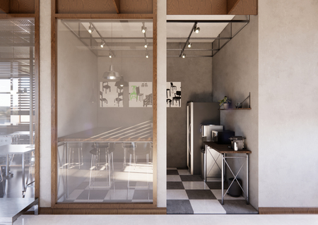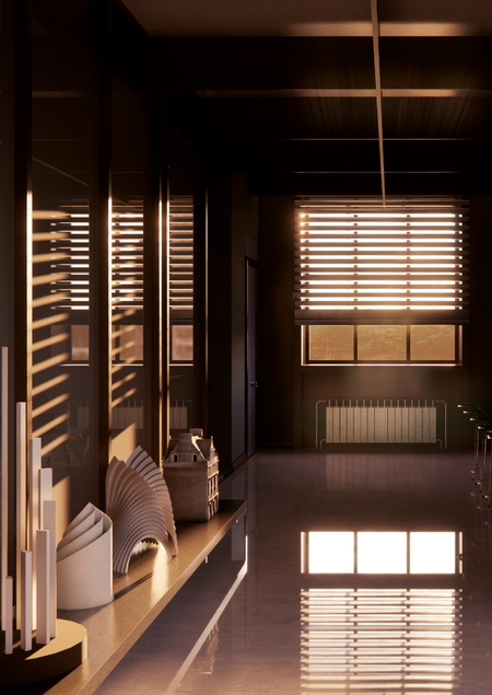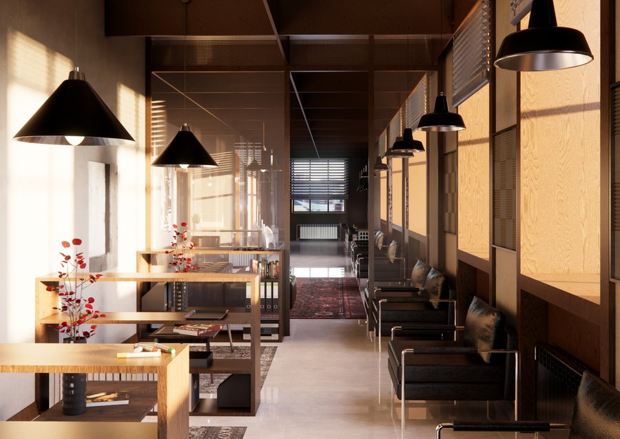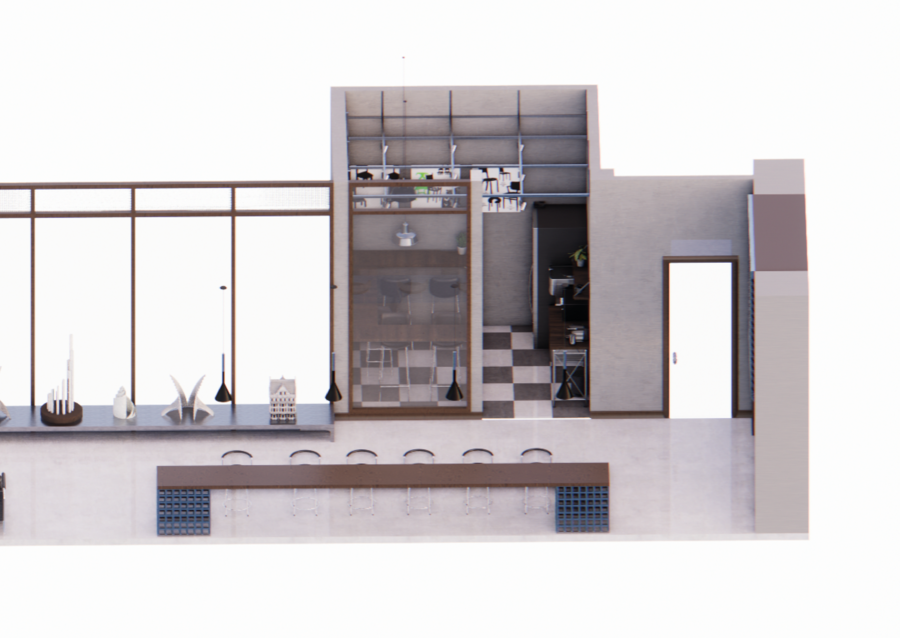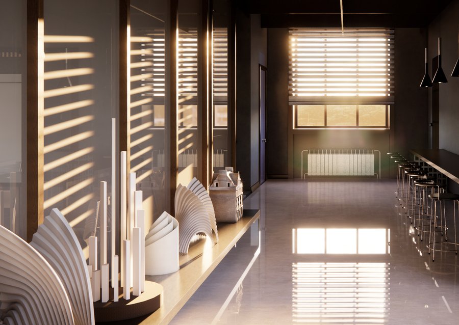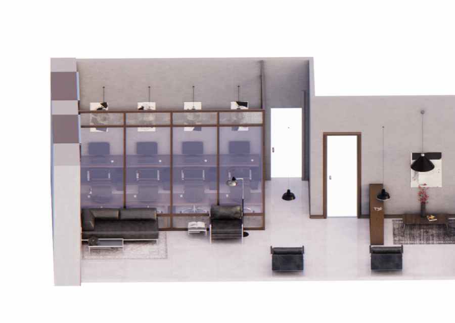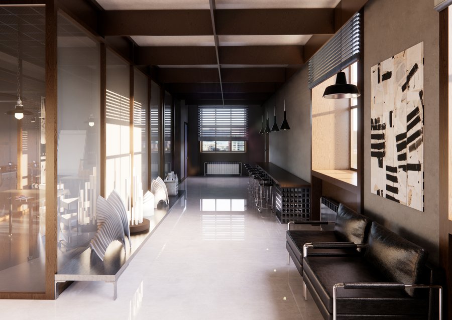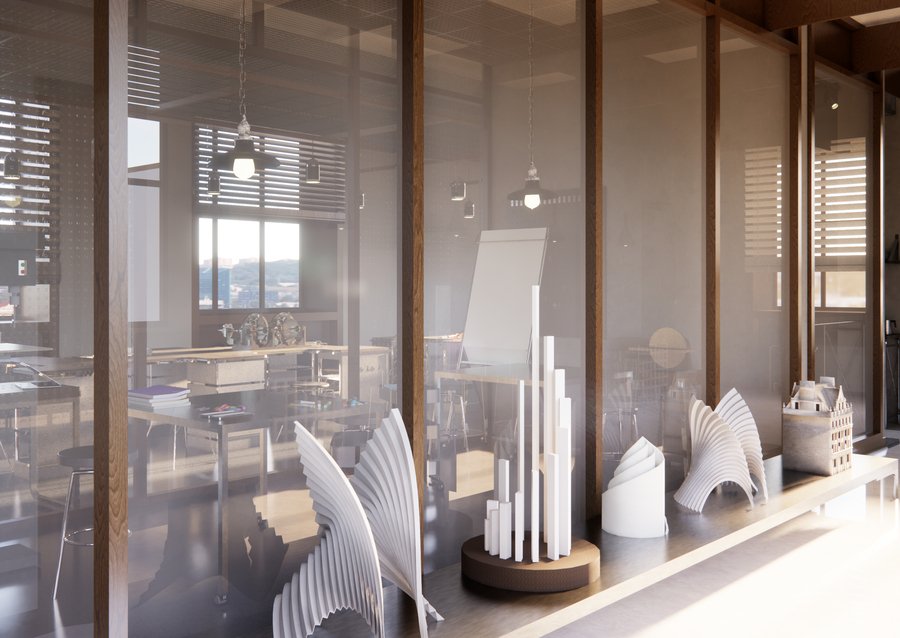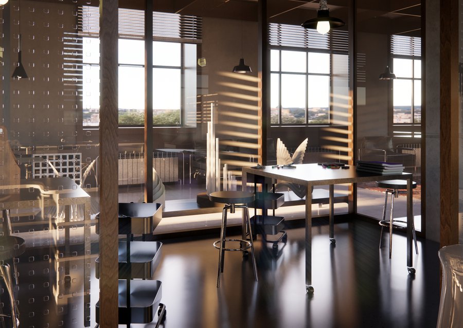 - платформа для макетов перед застекленной «грязной» зоной мастерской - кофе-поинт - большой общий стол напротив кофе-поинта, если там места закончились