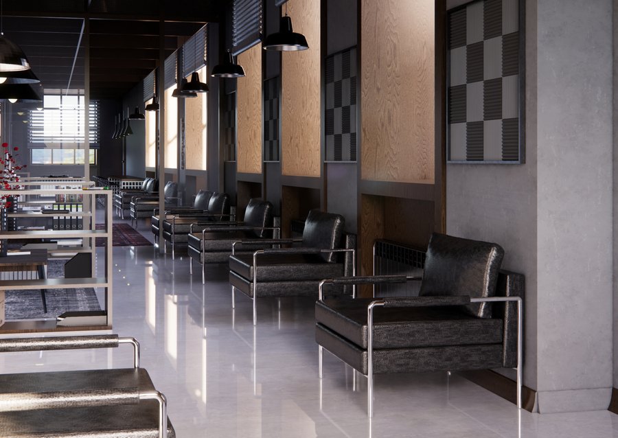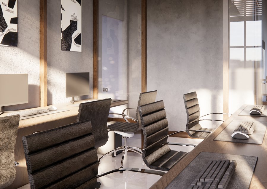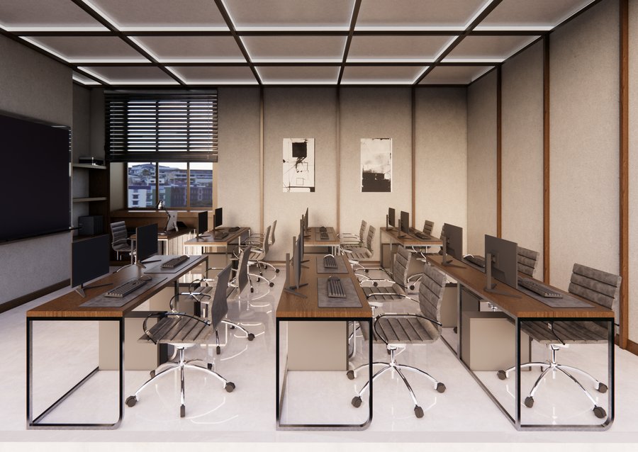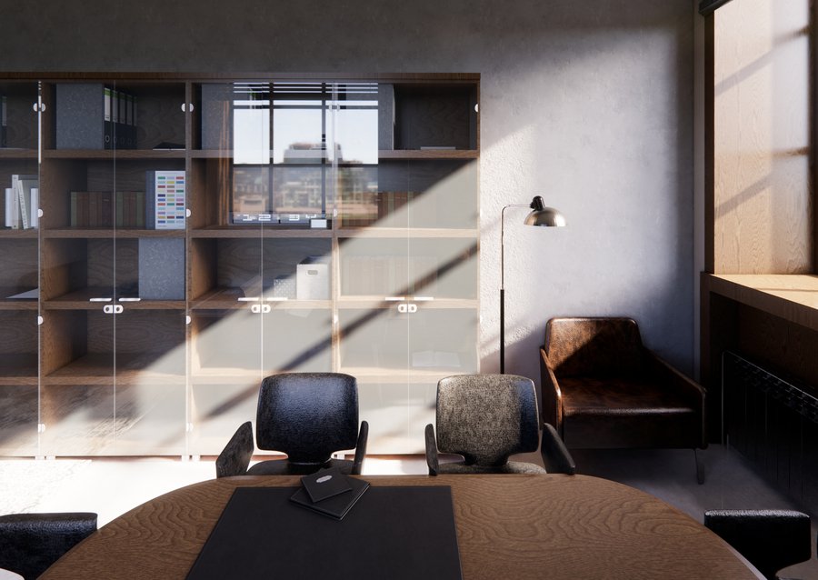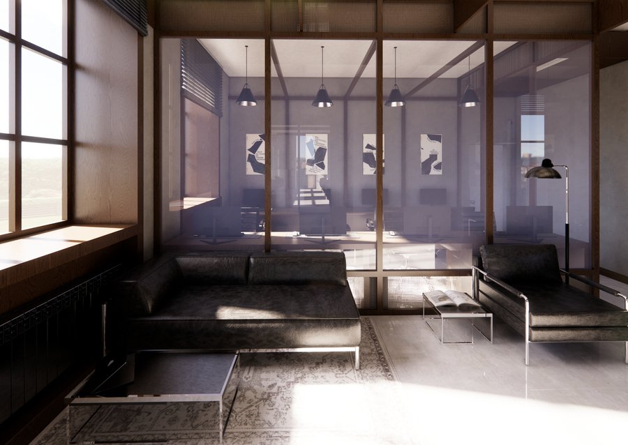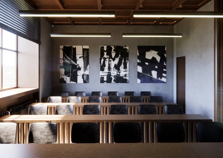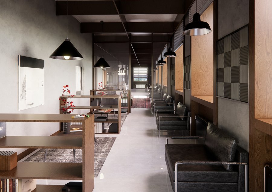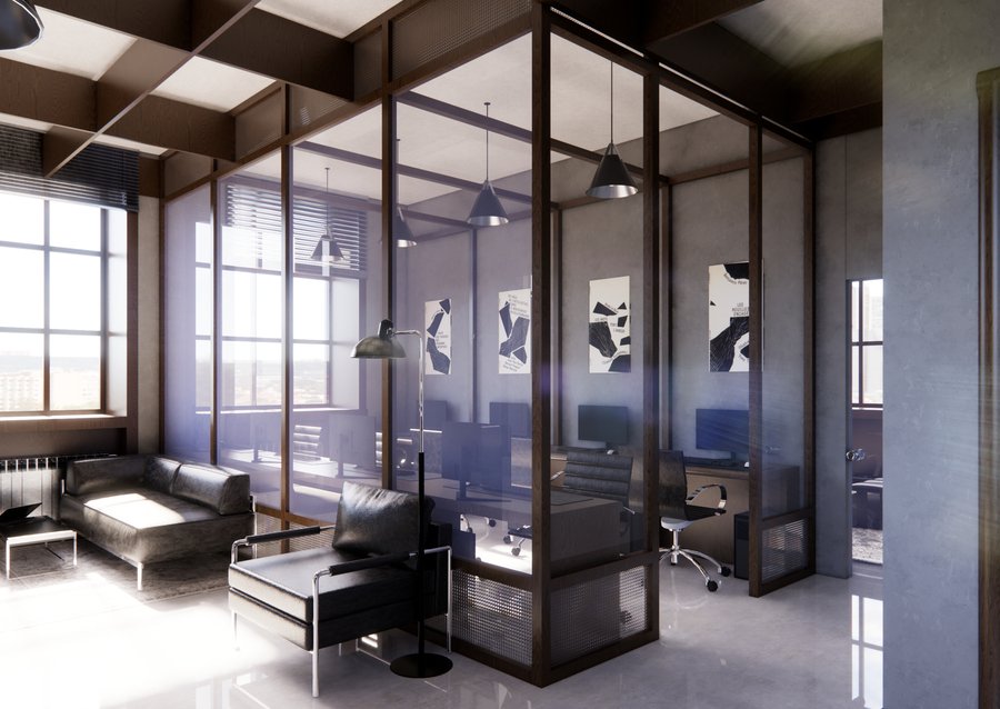 - мини-библиотека - одиночные места - акустические панели на стенах - звукоизоляционный потолок - стеклянные перегородки для визуального увеличения пространства