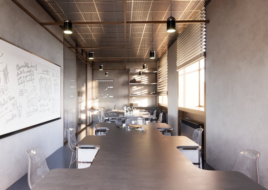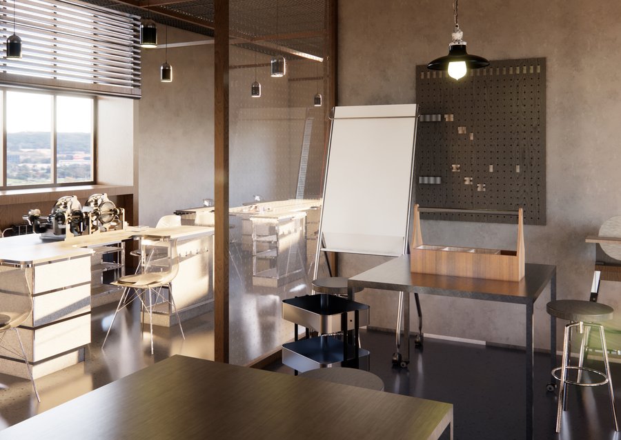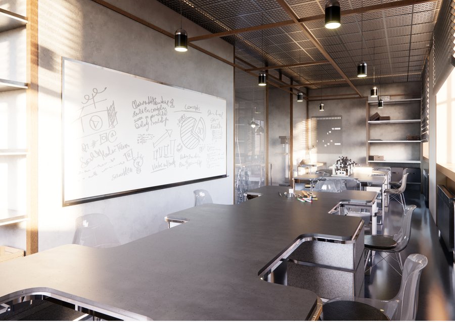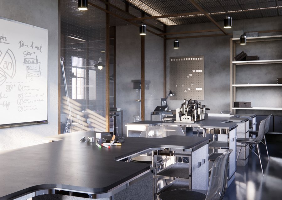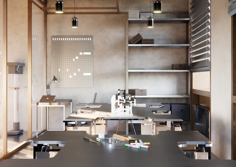 - большая зона хранения (3 вместительных стеллажа + ящики в рабочих столах) - маркерная доска для заметок и набросков - 2 больших фирменных стола на 12 человек - «грязная» зона, в которой есть 2 покрасочных стола на 4 человека и 2 деревообрабатывающих станка - потолок сетчатый, что позволяет вешать на него макеты для сушки