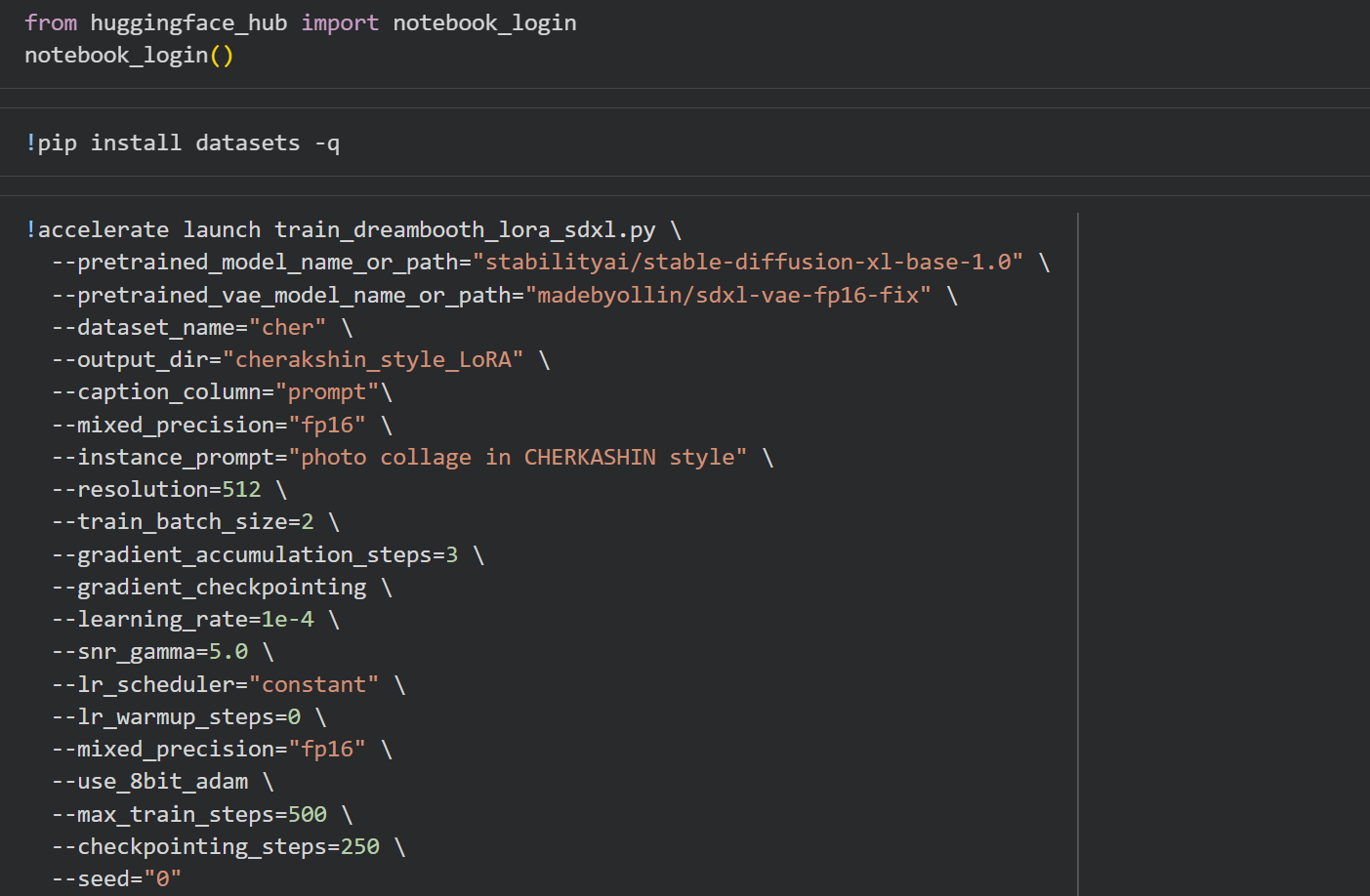 Устанавливаем Hugging Face, с помощью которого и будет проводиться обучение модели. Задаем параметры обучения: общее количество шагов обучения 500, каждые 250 шагов результат сохраняется, также были выставлены настройки, снижающие нагрузку на видеопамять. Сохраняем модель для дальнейшей генерации изображений.