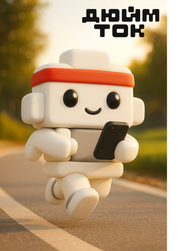 Промт левого постера: 3d minimal poster featuring cute modular mascot from «ДюймТок» running outdoors on a sunny morning, wearing a red headband and holding a smartphone, soft natural lighting, warm tones, cinematic depth of field, symbolizing energy, focus and short digital moments, modern clean composition, high quality render