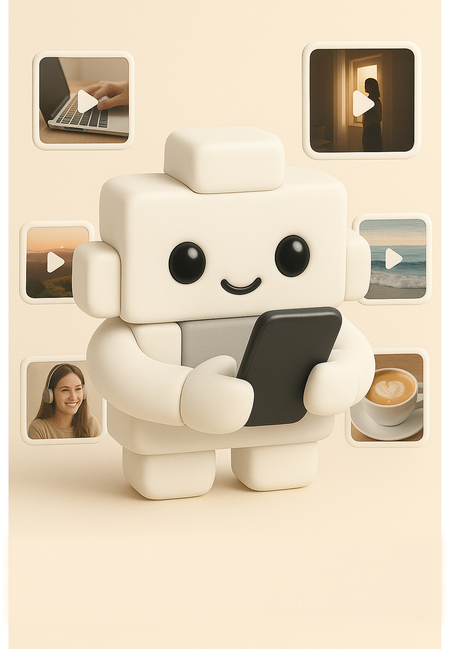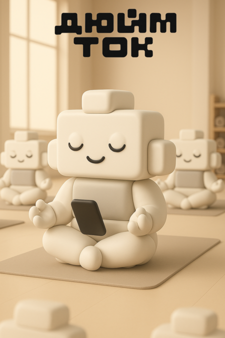 Промт правого постера: 3d minimal poster featuring cute modular mascot from «ДюймТок» sitting in a yoga pose with closed eyes, holding a smartphone calmly, surrounded by other mascots meditating in a bright neutral studio, soft warm beige tones, natural morning light, symbolizing focus, calm and digital balance, modern clean composition, high quality render