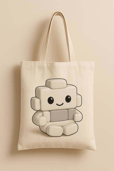 Промт для шопера: realistic fabric tote bag mockup on neutral background, featuring and cute modular mascot print, minimal warm lighting, beige and black color palette, modern lifestyle branding aesthetic, soft shadows