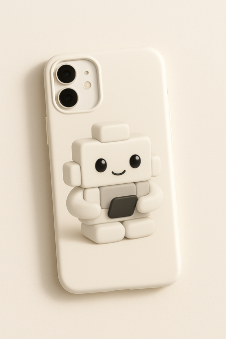 Промт для чехла: realistic smartphone case mockup in white and beige tones, small cute modular mascot illustration, minimal clean background, soft daylight, modern digital branding style