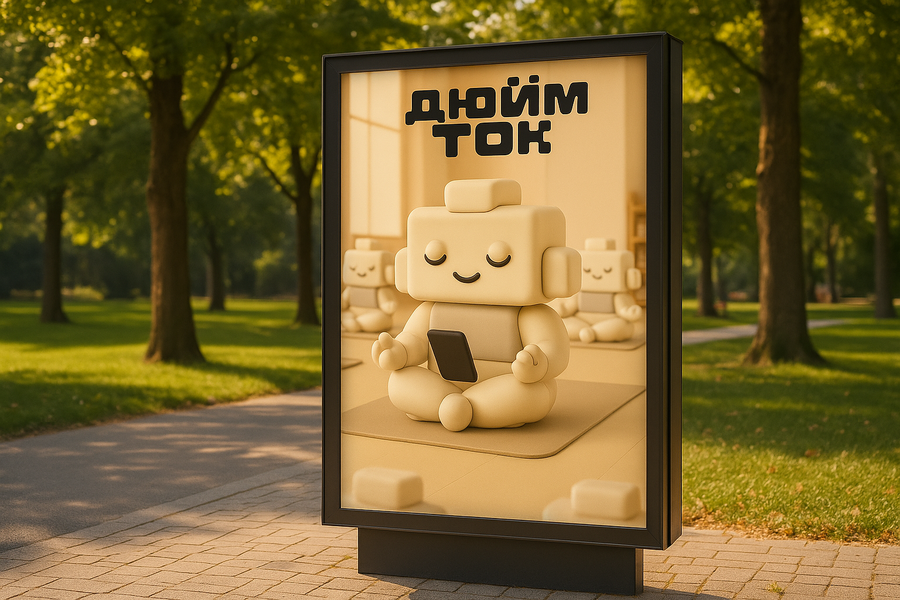 Промт постера в парке: realistic outdoor mockup of an advertising stand in a park, poster for the app «ДюймТок» with a cute modular mascot meditating and holding a phone, soft sunlight filtering through trees, calm atmosphere, high quality render, natural warm tones, modern minimalist branding