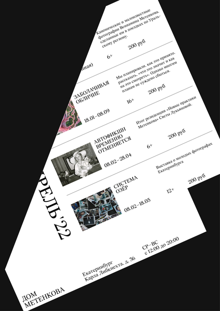 Дом Метенкова — м̶у̶з̶е̶й̶ ̶ф̶о̶т̶о̶г̶р̶а̶ф̶и̶и̶ арт-пространство, в котором историческая экспозиция сочетается с проектами современных фотографов и авторов, работающих с другими медиумами искусства. Командой мы разработали константы стиля для айдентики на время переезда музея в другое пространство. Моей личной частью работы стала айдентика для выставок в Доме Метенкова.
