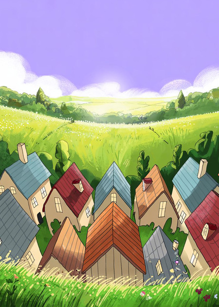 Prompt: view of the village from above with roofs, lands, lots of grass and greenery. Stylized as a children’s book angular ideogram.ai