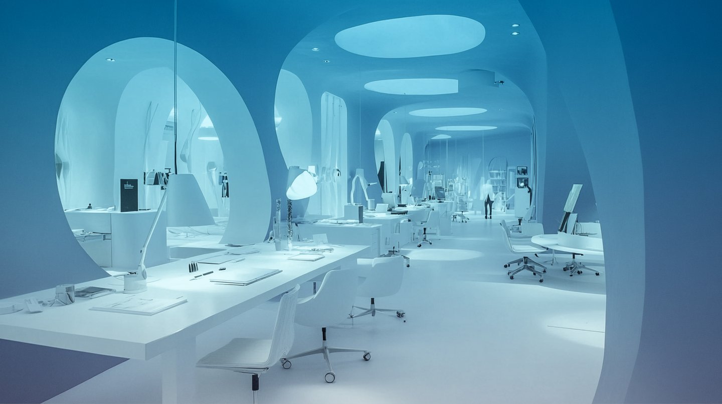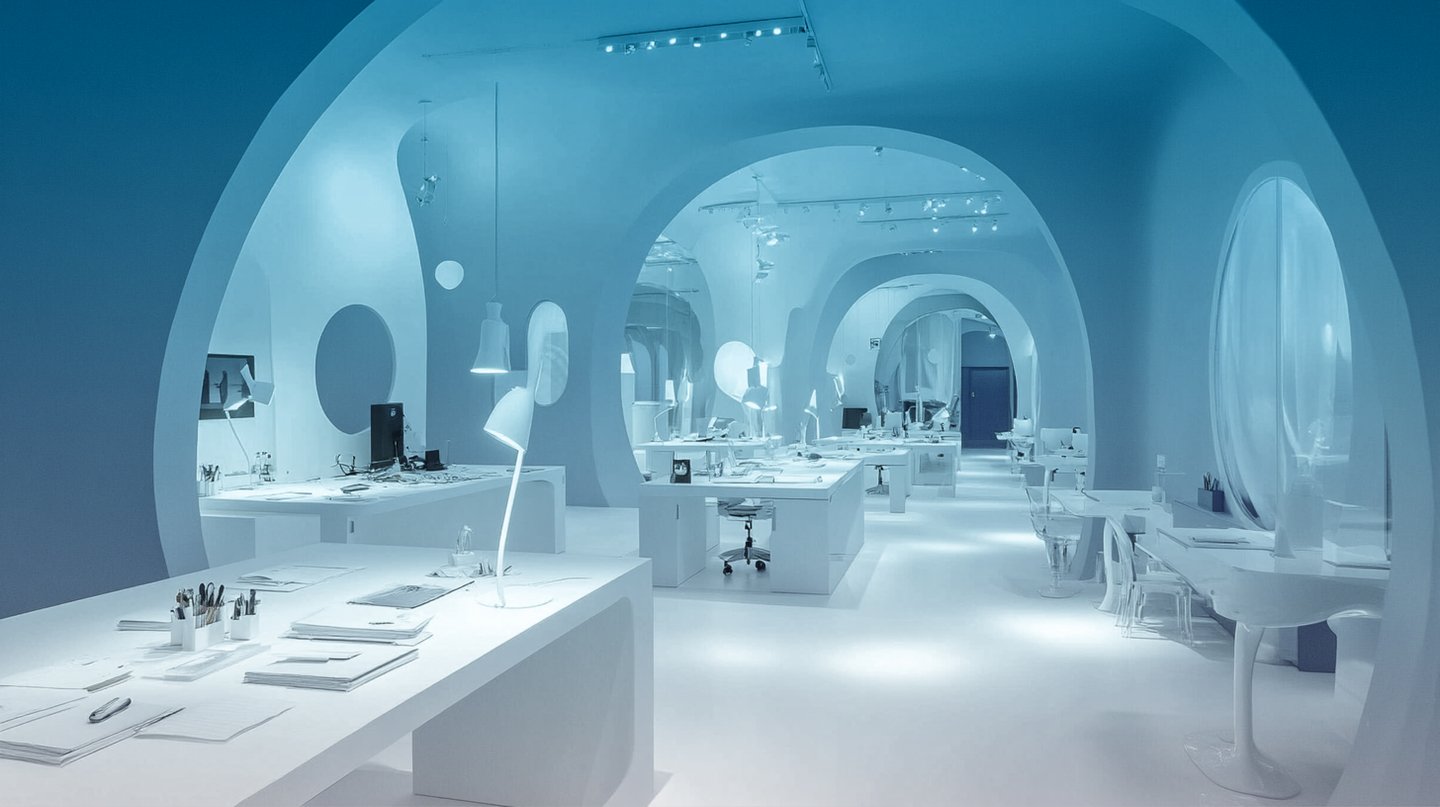Mj: white and blue office of an architecture firm: lots of desks, working materials, creative chaos, parts of multimedia installations and lamps--ar 16:9