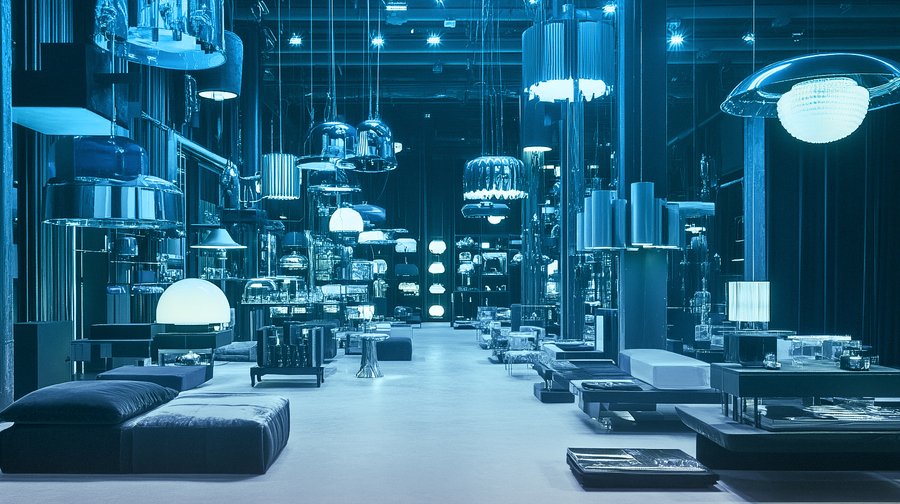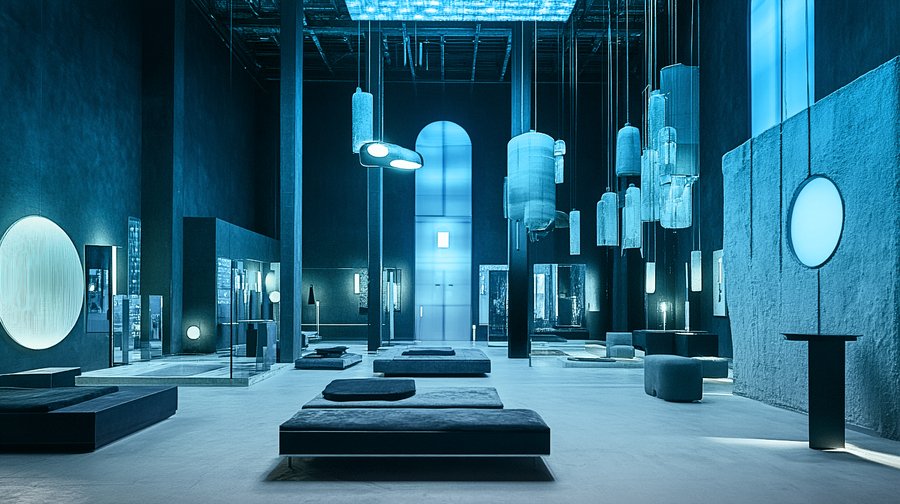 Mj: Ricardo Bofill-style black and blue warehouse, many designer lamps and installations of various sizes stand and lie close --ar 16:9