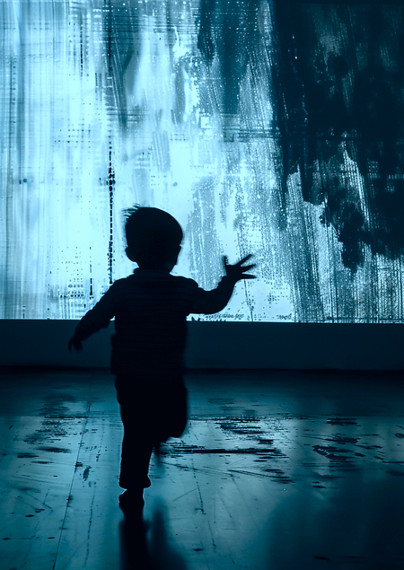 Промты для 3 верхних генераций слева направо: 1. Dome-shaped room: on the floor is a huge head with projected image of people’s faces, with fabrics hanging from above 2. A dark room: an abstract image is projected on the wall, a child is running in front of the wall and waving his hands. a dark room, in the middle of which there is 3. A room in which the floor is covered with a blue cloth, on which people are lying, and in the center there is a spiral staircase, screens with an abstract blue image on the walls.