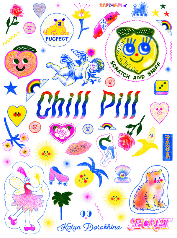 Зин Chill Pill отправляет читателя в путешествие по миру с бассейнами в форме сердца, эластичными мопсами, ослепительными движениями на танцполе, прогулками верхом на белой лошади с улыбкой на лице и мартини в руке. «Chill pill» отпечатан на ризографе московским коллективом Sputnikat Press.