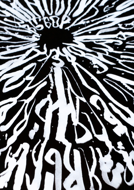 Мир — круг, буквы — люди, они все как одно целое стремятся в темное пространство, которое никогда не может быть заполнено, потому что жизнь рождает новую жизнь и новые действия.
