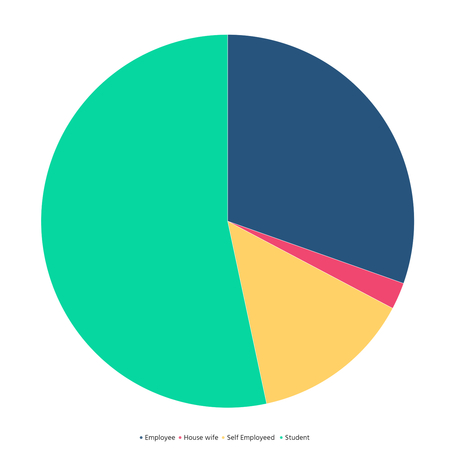 Далее я решила посмотреть на трудоустройство. В датасете были представлены 4 категории людей: студенты, домохозяйки, самозанятые и обычные работники. Круговая диаграмма отлично визуализировала все данные. Согласно ей, абсолютное большинство, 53,4% составляют студенты, после идут рабочие и самозанятые — 30,4% и 13,9% соответственно; домохозяйки занимают последнее место — менее 3%. Такое соотношение весьма логично — у студентов и самозанятых не хватает ни сил, ни, возможно, социальных навыков, чтобы сходить в магазин, рабочие, вероятнее всего, заказывают доставку на рабочее место, а домохозяйки же имеют возможность приготовить всё на собственной кухне.