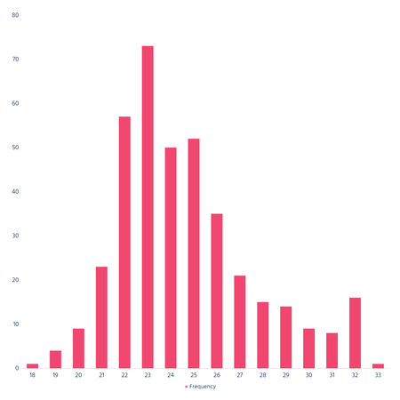 Первый график — анализ возрастов. В датасете был указан диапазон от 18 до 33 лет. Как можно заметить, большинство, пользующаяся услугами онлайн-доставки, — молодые люди в возрасте примерно 22 — 23 лет.