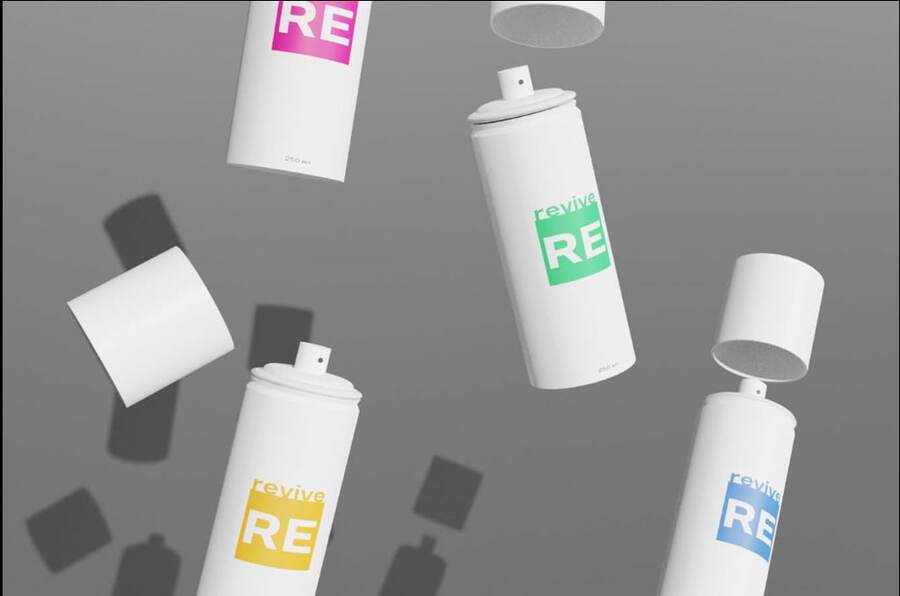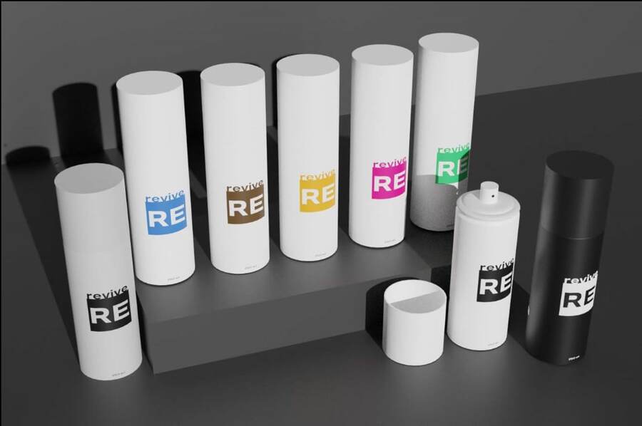 prompt: generate a 3D render of colored spray paint cans for the REVIVE brand, which are on a shelf in a store next to other products; the store is bright and youthful; the image uses primary colors (black and white) and secondary colors (red, orange, green and blue)