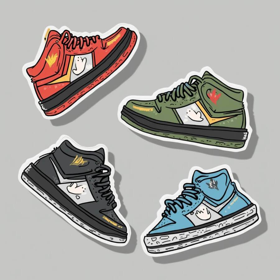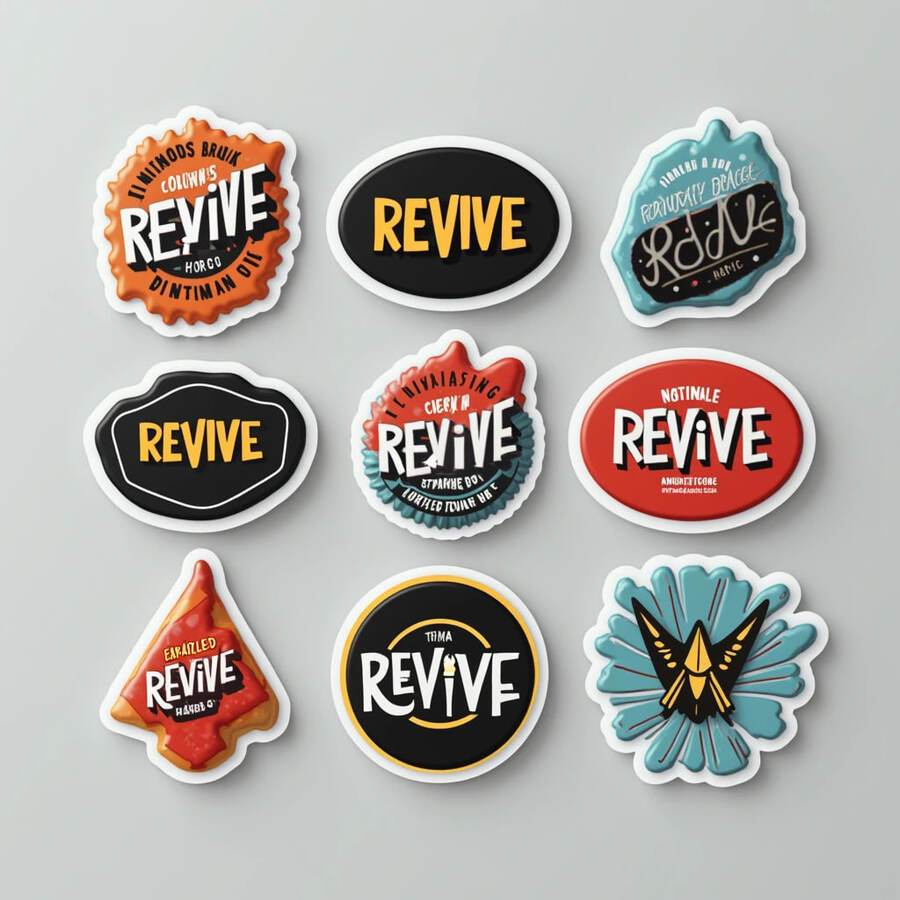 prompt: generate a mockup of unusual small stickers for the shoe customization brand REVIVE using primary colors (black and white) and additional colors (red, orange, green and blue) on a neutral gray background