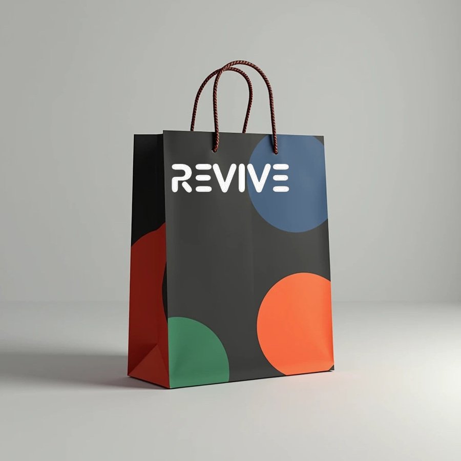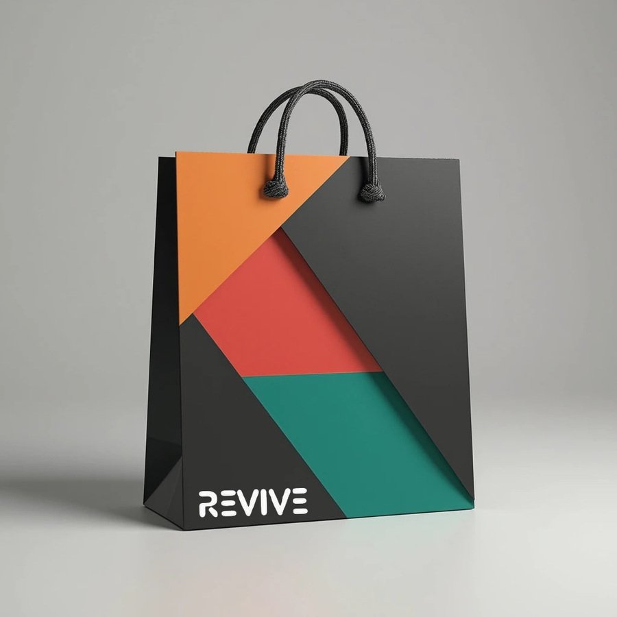 prompt: generate a gift bag mockup for shoe customization brand REVIVE using primary colors (black and white) and secondary colors (red, orange, green and blue) on a neutral gray background