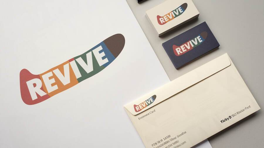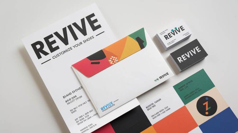 prompt: generate a mockup of printed materials (business cards, envelopes and papers) on a white background for the shoe customization brand REVIVE using the color palette (white, black, red, orange, green and blue)