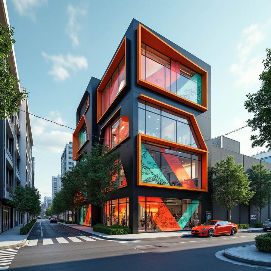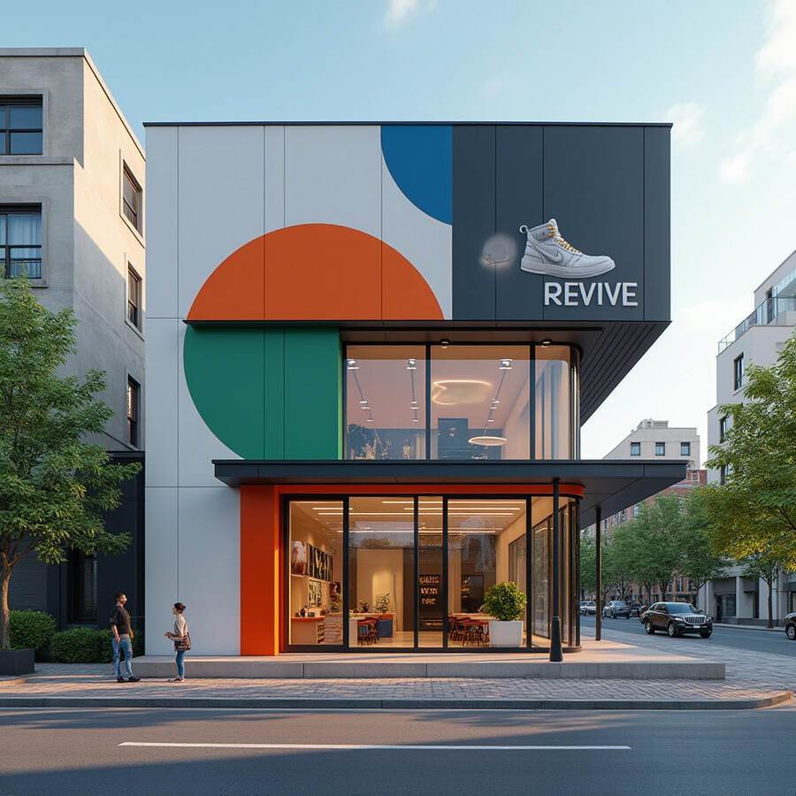 prompt: generate a building for the office of shoe customization brand REVIVE using primary colors (black and white) and secondary colors (red, orange, green, and blue) on a bustling city background