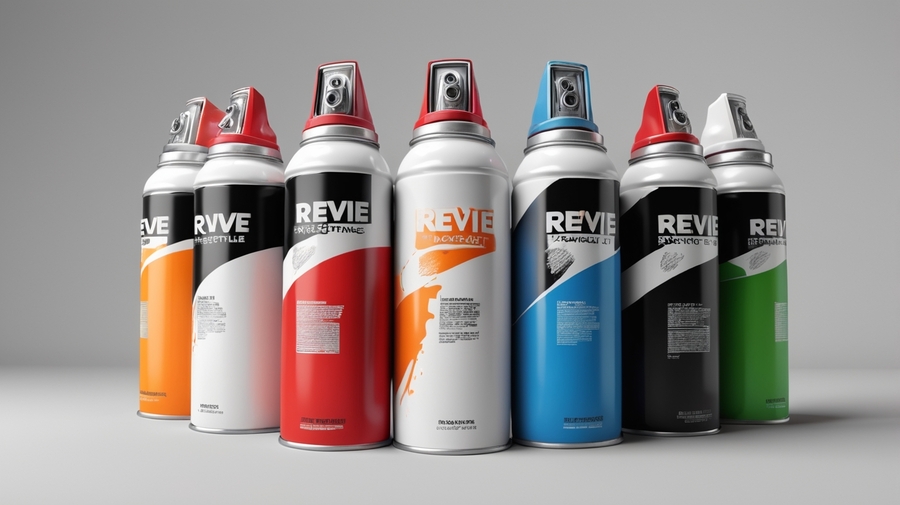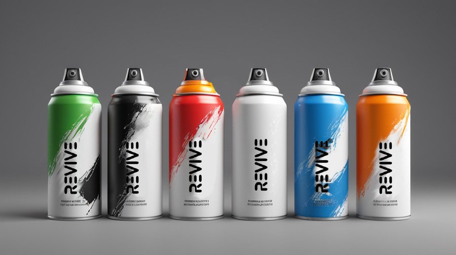 prompt: generate a 3d render of 5 models of white spray paint cans for the shoe customization brand REVIVE using primary colors (black and white) and additional colors (red, orange, green and blue) on a neutral gray background