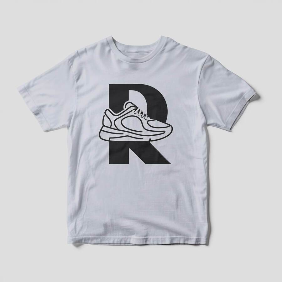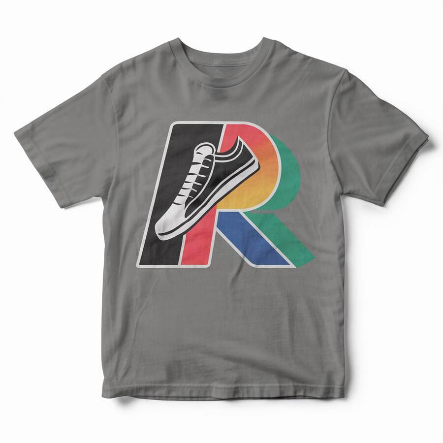 prompt: generate a mockup of a t-shirt for shoe customization brand REVIVE using primary colors (black and white) and secondary colors (red, orange, green and blue) on a white studio background