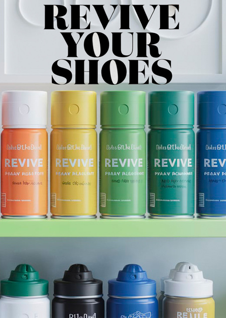 prompt: creating advertising posters for a modern spray can brand for customizing shoes REVIVE using a color palette (white, black, red, orange, green and blue).