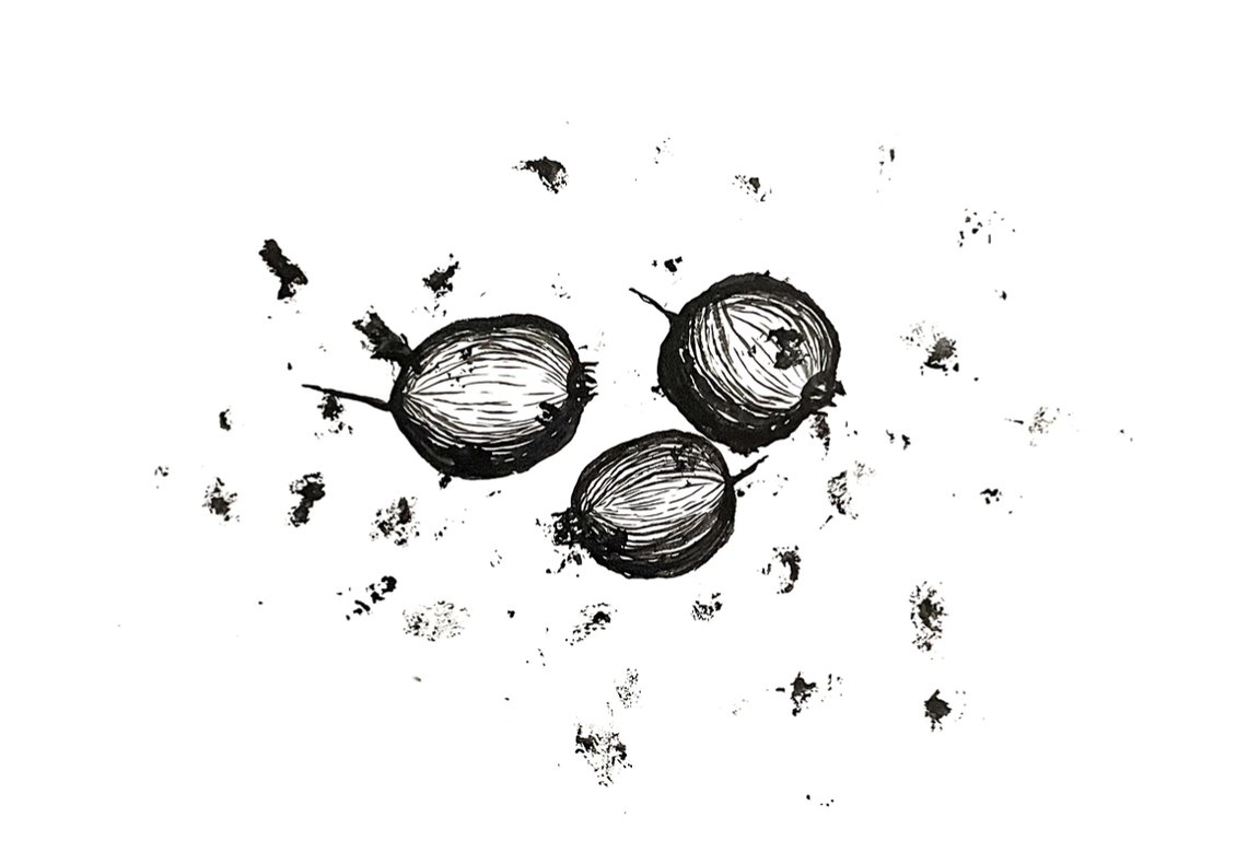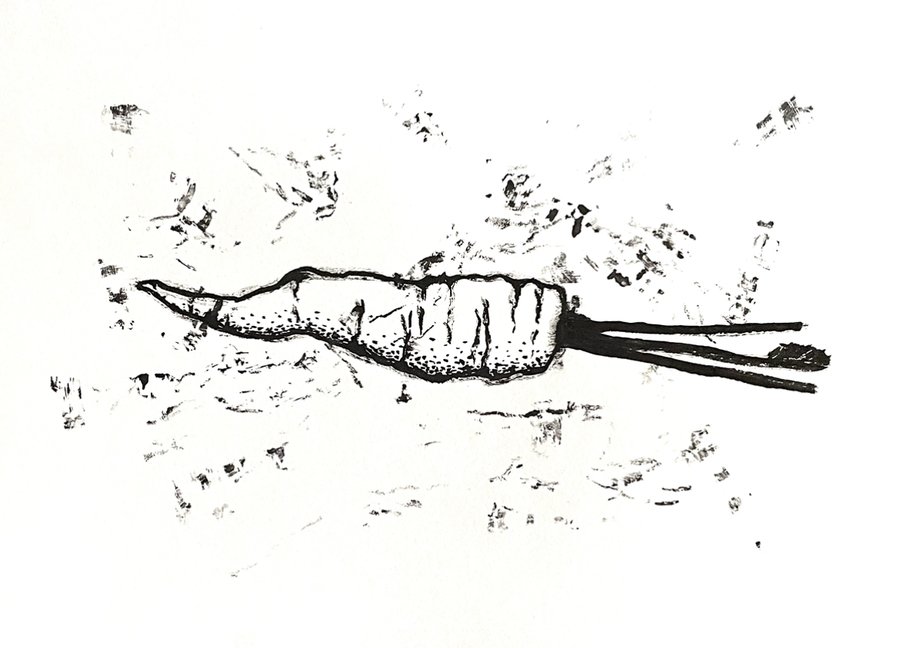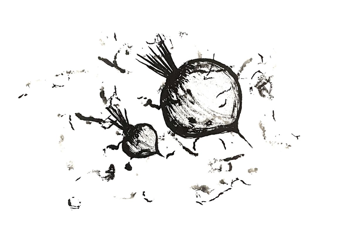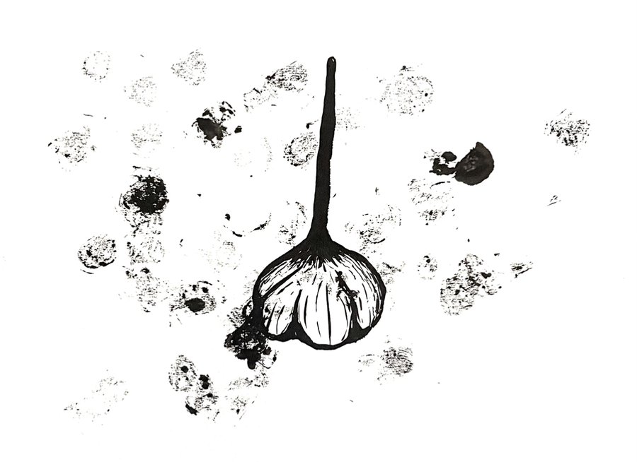 Я брала овощи, заботливо выращенные моей бабушкой, окунала в тушь и отпечатывала их на бумаге так, чтобы получился фон для будущего рисунка. А дальше в ход шла кисть… и в результате вырисовывалась готовая работа