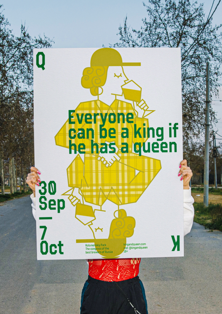Короли и Королевы — самое яркое событие года для истинных ценителей крафтового пива! На фестивале представлены эксклюзивные сорта пива, созданные лучшими мировыми пивоварнями. В концепте заложена идея колоды карт. На них часто используются короли с разными атрибутами, в том числе с напитками. Рубашки карт схожи с хипстерской клеткой, которую они часто носят.