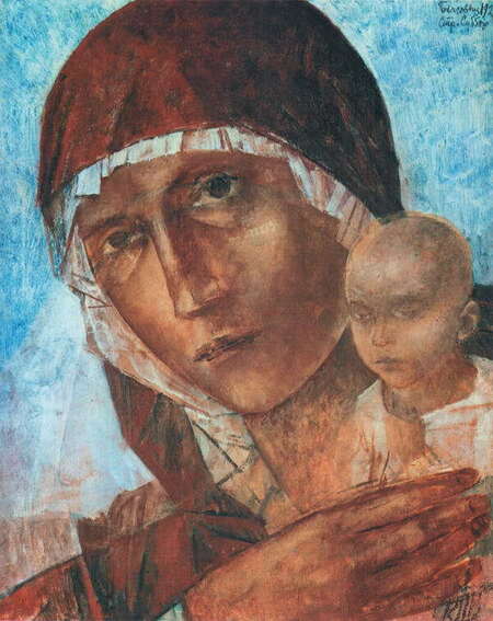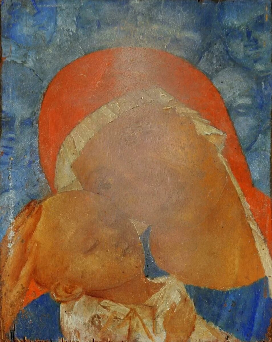 Картина 1920 года «Богоматерь с младецнем» словно находится в диалоге с «Умилением злых сердец». Богородится предстает в тех же одеждах, снова на синем фоне, наполненном призрачными образами.