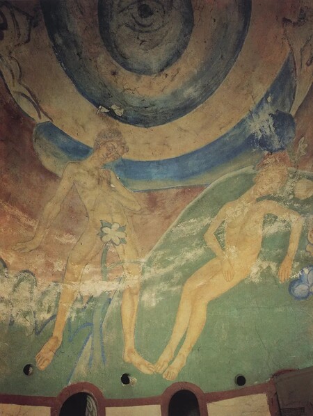 Слева — «Изгнание из Рая» К. С. Петров-Водкин; 1911 г.; Справа — «Изгнание из Рая» Фреска Мазаччо в капелле Бранкаччи, 1426–1427 гг.