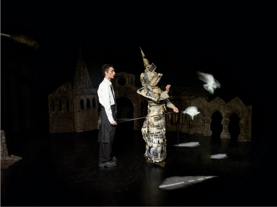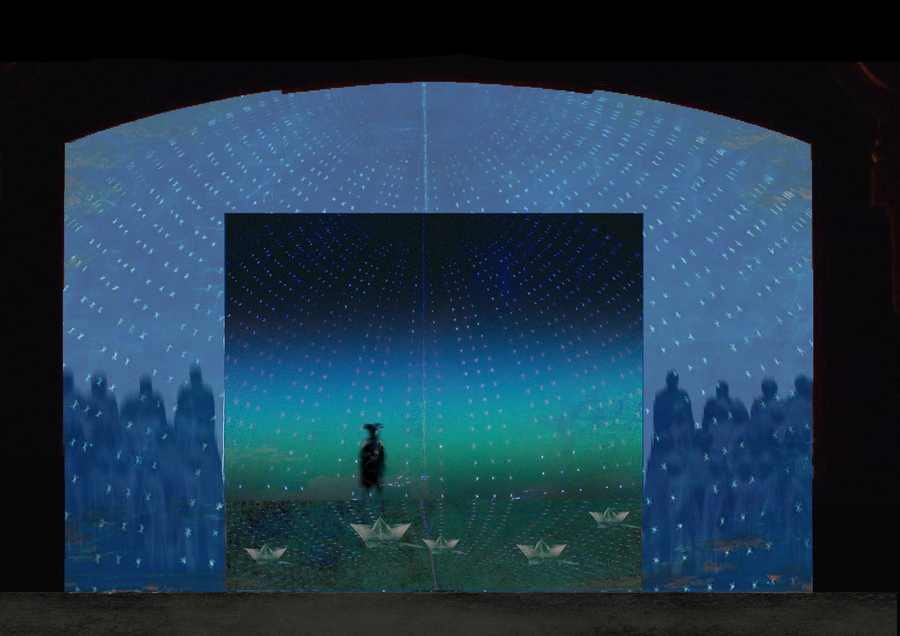 Фраза, ставшая поводом для сценографического решения находится почти на первых строчках текста: «будь этот корабль не прочнее ореховой скорлупы» Меня зацепил этот символ хрупкости и при этом почти отчаянной надежды в путешествии против сил природы. В дальнейшем именно на обломках этого корабля, означающего потерянное величие, иступленное богатство героям предстоит построить «дивный новый мир». следующими обстоятельствами пространства становятся иллюзии. мы, как и герои, не до конца понимаем, как работает этот мир: «мы созданы из вещества того же, Что наши сны. И сном окружена Вся наша маленькая жизнь» Складывая два этих «предмета»: корабль и иллюзия, я пришла к образу оригами кораблика, простой, тонкий лист бумаги, может быть, неудавшийся набросок Шекспира, благодаря будничной магии ставший сложной формой, покоряющей воду.