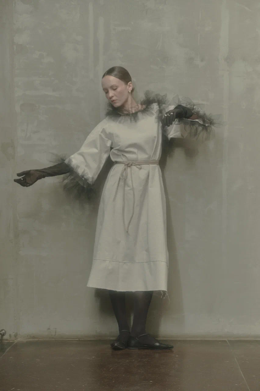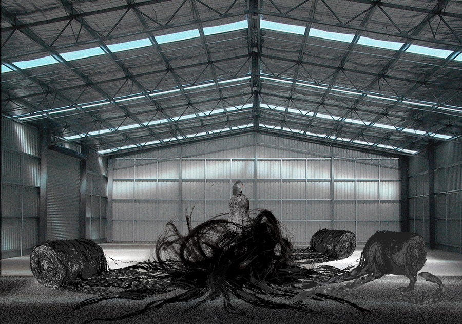 Сценография для перформанса «может быть когда-то ты здесь был» Девушка распускает свое платье на ниточки и обвязывает ими лежащие на полу скорлупки яйца. Скорлупки крошатся под ее ногами.