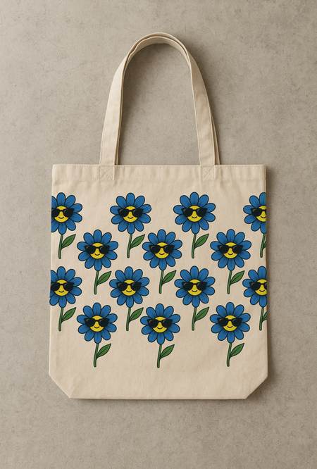 Промпт: Seamless pattern of identical blue flowers with yellow centers. The flowers are wearing black sunglasses.