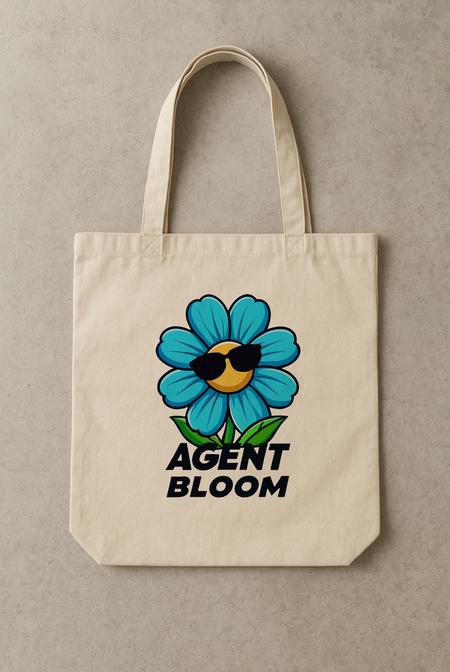 Промпт логотипа: A blue flower with a bright yellow center. The flower is wearing black sunglasses. The flower is accompanied by the phrase «Agent Bloom» in black font. The colors used are blue, yellow, green, and black. The background is white.