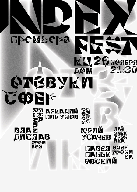 Плакат для фестиваля в кц «Дом». За основу композиции была взята акцидентная типографика, созданная из шрифта Golos Буквы символизируют разбивающееся стекло, а расплывчатые силуэты изображают «отзвуки сфер».